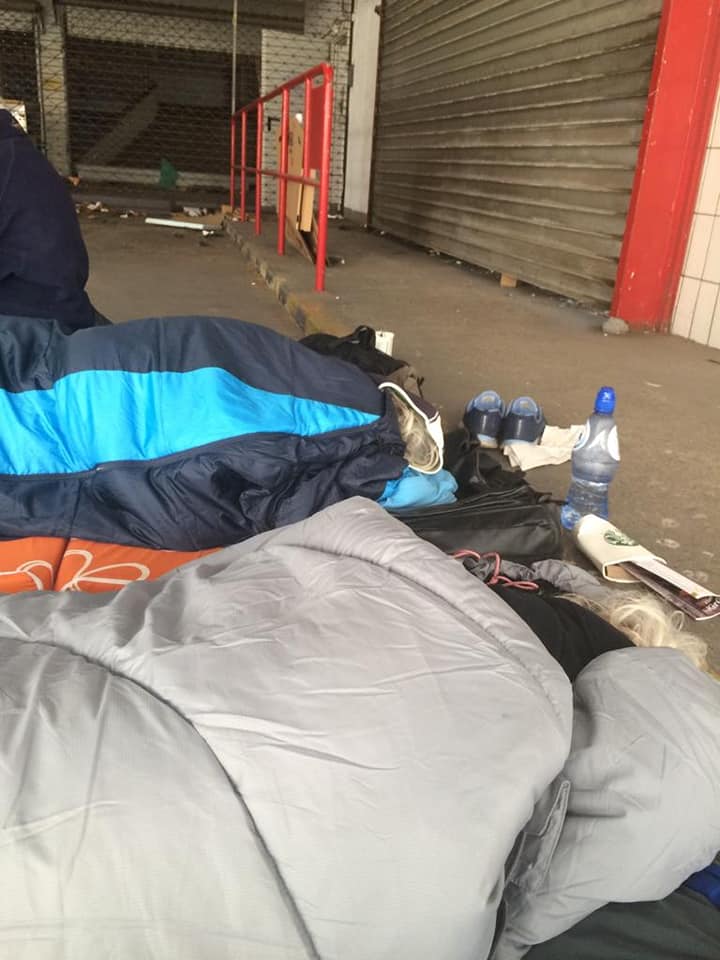 De eerste avond hadden we in een mum van tijd voldoende karton gevonden en een mooie plek om te slapen, een mooi beschut plekje bij kantoren. De bewakingsdienst vond dat om 3.00 uur ’s nachts geen goed idee. Omdat wij zonder protest opstapten en hem vroegen om advies, bracht hij ons naar een parkeergarage die op de nominatie van sloop staat. Er stond een hek omheen en het bleek het thuis van een aantal daklozen (de sokken hingen aan de muur te drogen). Ze lieten ons eerst niet in het hek. Maar we mogen erin: en dan liggen we daar, op een rijtje zes vrouwen op karton. Uiteindelijk hebben we er 3 keer geslapen. Twee keer nodigden mensen ons uit om de nacht bij hun thuis te logeren. Een man bedankten we vriendelijk – we proefden zijn behoefte aan een feestje met ons. Van een vrouw accepteerden we haar uitnodiging met veel plezier! Twee matrassen en wat matjes – we sliepen 10 uur achter elkaar hutjemutje in een tuinkamer op de grond.